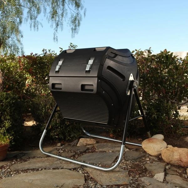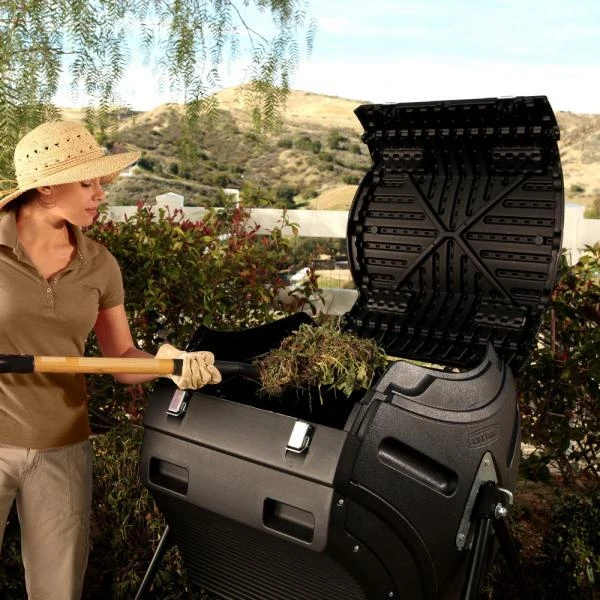 Bovendien worden de te composteren elementen optimaal gemixt door de non-cylindrische vorm van het compostvat. Dit afgesloten compostvat is ontoegankelijk voor vliegende insecten en storende knaagdieren en minimaliseert de geurginder die vaak met een open composthoop gepaard gaat. De trommel heeft een extra groot deksel voor het gemakkelijk vullen en oogsten van de compost.