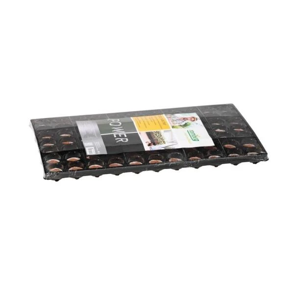 Opkweekplaat met 77 schijfjes of tabletten gemaakt van samengeperste kokosvezels voor het maken van kweekpotjes voor het zaaien en verspenen.